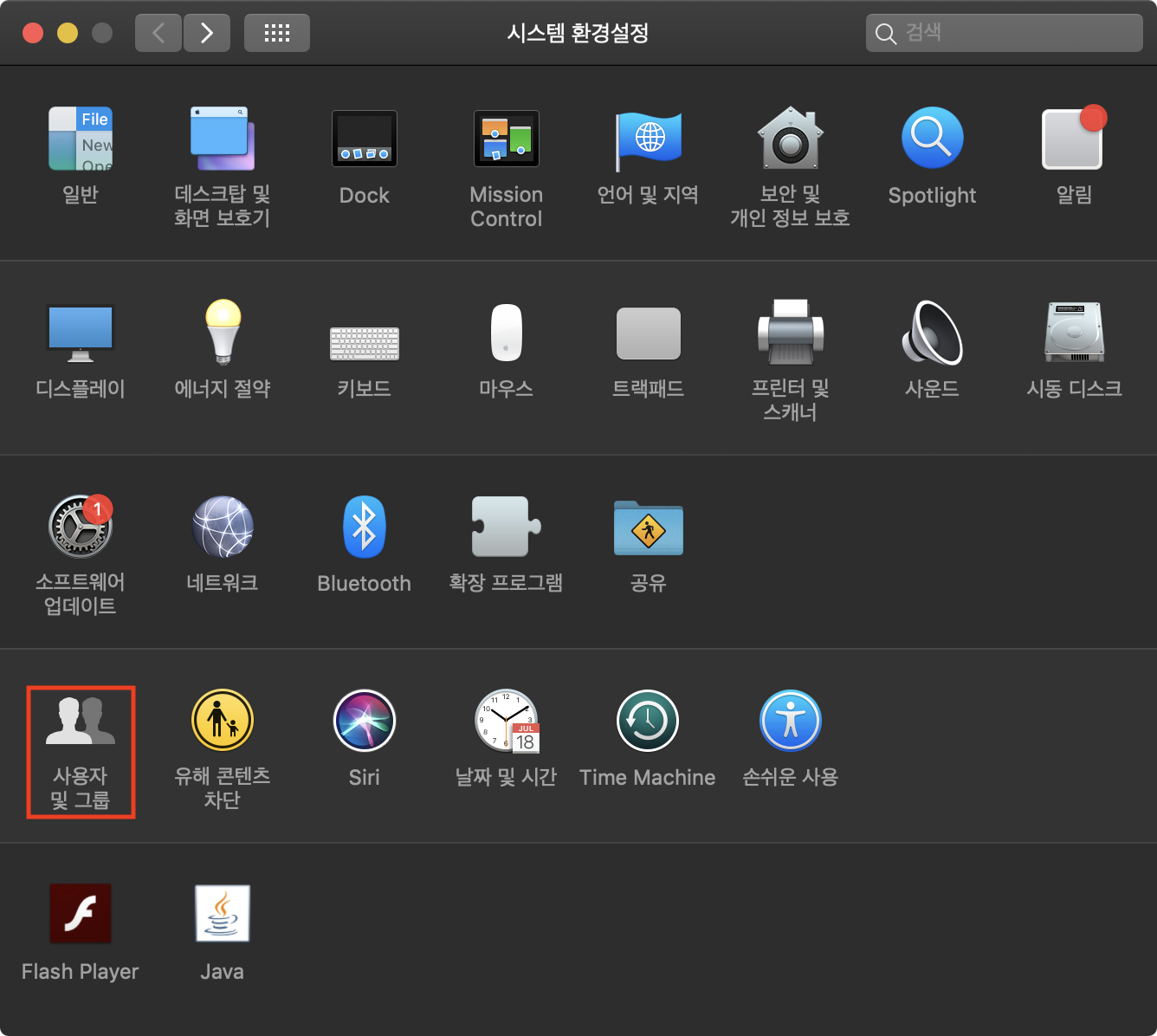 ① → 시스템 환경설정 → 사용자 및 그룹을 선택