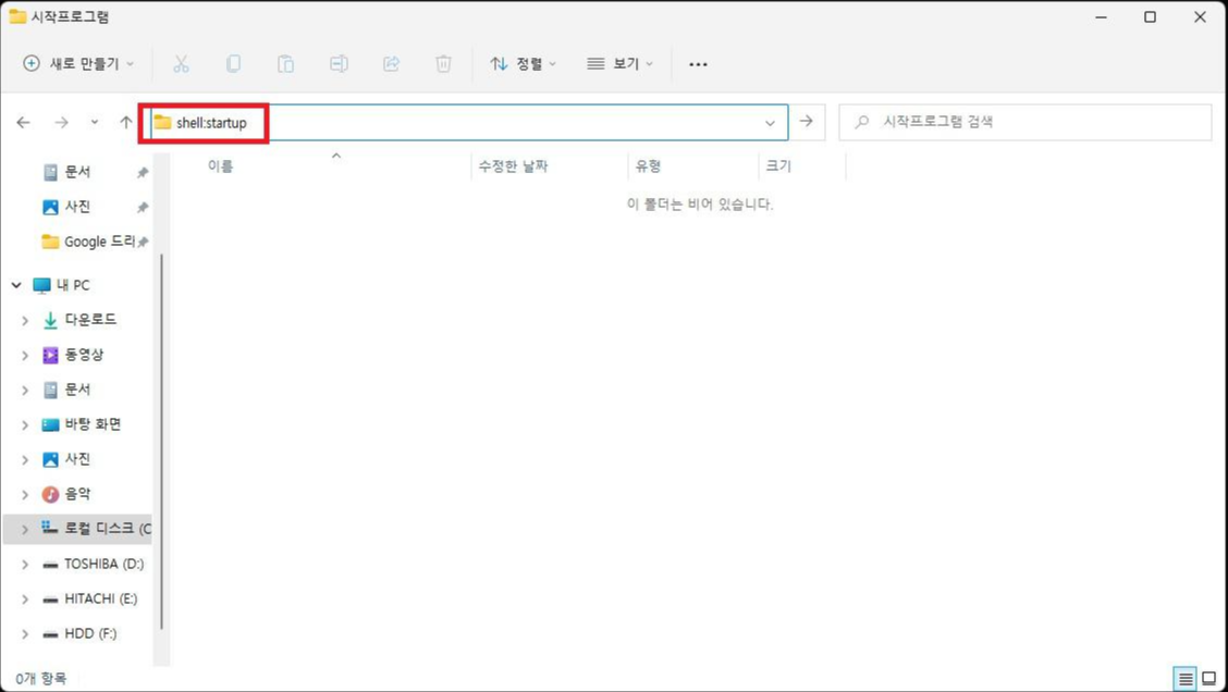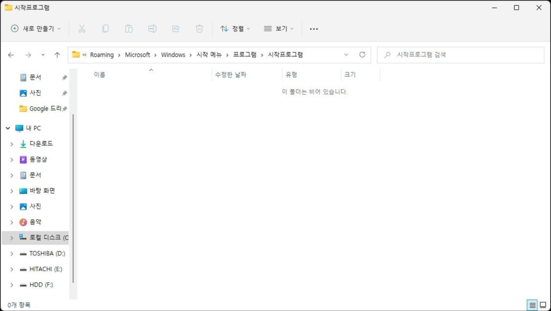 그 뒤에 앤터키를 누르면 밑에와 같이 「시작프로그램」 폴더로 이동을 하게 됩니다